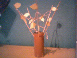 Deze knutselopdracht heb ik bedacht tijdens mijn werk als recreatiemedewerker. Het is heel simpel. Je rolt het WC-rolletje in bruin papier, en knipt de uitstekende kanten af. Vervolgens teken je met potlood een stuk of vijf stippen aan de bovenkant van het rolletje, en ook aan de onderkant. Deze stippen moeten redelijk ver uit elkaar staan. Daarna prik de stippen met een prikpen open. Je kunt dan satéprikkers door de gaatjes schuiven: aan de bovenkant erin en aan de onderkant aan de andere zijde een klein stukje eruit. Deze prikkers zijn de takken van de boom. Met wol span je daarna draadjes wol tussen de takken. Bruine wol is het mooist, maar toen ik dit voorbeeld maakte had ik alleen witte wol. Als je een soort spinnenweb van draden hebt gemaakt, is het daarna niet moeilijk meer. Je hoeft alleen nog blaadjes uit te knippen in verschillende herfstkleuren. Dat gaat natuurlijk het makkelijkst als je knutselpapier een paar keer dubbelvouwt. Zorg dat je een randje overhoudt om te plakken, want je gaat deze blaadjes om de takken en de draadjes plakken. En zo zie je dat je herfstboom steeds mooier wordt.